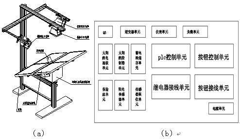 光伏發(fā)電控制監(jiān)控系統(tǒng)由電池板單元、太陽能控制器單元、蓄電池單元、保險單元、陽光傳感器、傳感器限位單元、模擬太陽單元、兩軸聯(lián)動單元、plc控制單元、繼電器單元、按鈕及按鈕接線單元、和相應(yīng)的逆變器儀表電源組成。光伏發(fā)電控制監(jiān)控系統(tǒng)采用接插線的形式進行接線,方便學生自行設(shè)計實訓(xùn)。